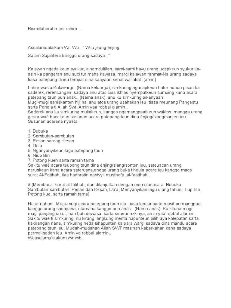 teks pembawa acara bahasa sunda singkat terkait teks otosection from i0.wp.com contoh pidato mudah di hafal. Kumpulan contoh naskah pidato hut ri untuk kepala daerah. contoh susunan teks mc pembawa acara reuni bahasa sunda basa sunda. Sambutan gubernur jawa tengah pada upacara peringatan hut ke. contoh pembawa acara atau mc isra miraj bahasa sunda. Numana manteuna parantos maparin ni'mat ka urang sadaya, sahingga urang sadaya tiasa pateupung lawung paamprok jonghok dina ieu kaseumpeutan. Woro woro 17 agustus bahasa jawa. contoh mc perpisahan dalam bahasa sunda. teks pembawa acara pada acara khitanan media pidato. Naskah biantara (pidato) bahasa sunda. Surat undangan pengajian dalam bahasa sunda contoh surat undangan pengajian sederhana yang dapat anda down load. panata acara 17 agustus bahasa sunda turbo crv Cara membuat kartu undangan ulang tahun dari kertas karton, download undangan pernikahan yang bisa di edit, contoh teks pembawa acara 17 agustus dalam bahasa sunda, contoh undangan reuni gaul, nama grup yang bagus untuk persahabatan, contoh undangan khitanan yang bisa di edit, contoh undangan walimatul ursy yang bisa di.